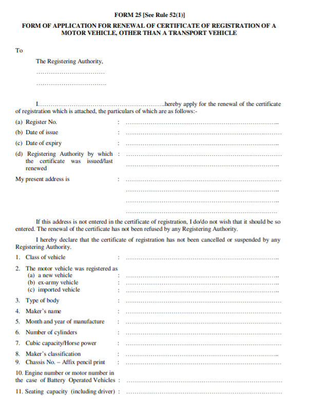 - Apply for renewal of rc, certificate of registration in Form 25 to the Registering Authority in whose jurisdiction the vehicle is, not more than 60 days before the date of its expiry
