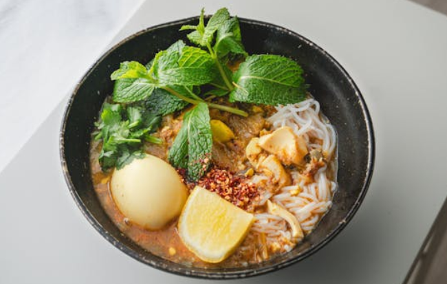 It is a spicy noodle soup with a rich coconut milk soup. It typically includes noodles, prawns, cockles, bean sprouts, and tofu puffs. It costs around ₹300 – ₹450