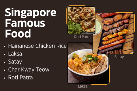 The most famous food in Singapore is Hainanese Chicken Rice, often considered the national dish. Other popular dishes include Chili Crab, Laksa, and Satay.