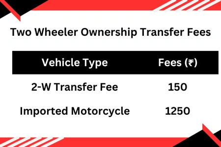 When a bike or car is sold, the RTO charges vehicle ownership transfer online fees to update the ownership details. The 2 wheeler transfer fees vary slightly based on: