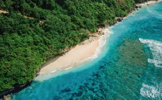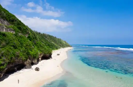One of Bali’s hidden gems; Green Bowl Beach lies at the base of a steep cliff and is accessible via a long staircase. The beach features white sands and vibrant green cliffs, with hidden caves offering shade.