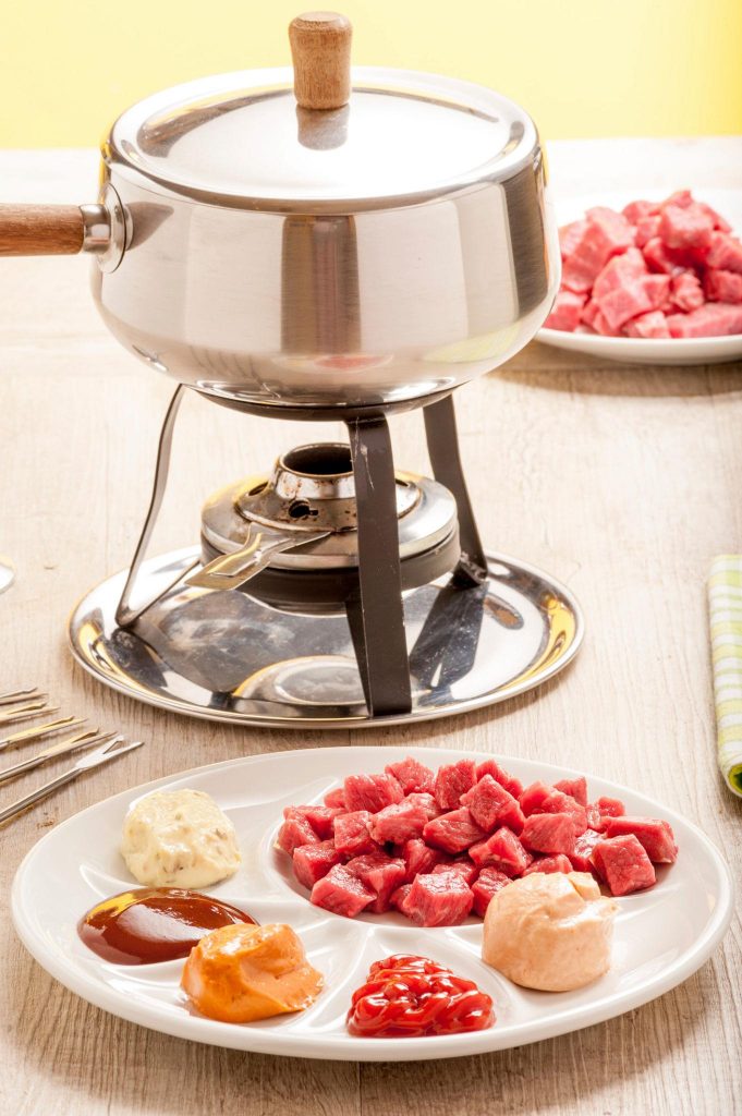 - Fondue Bourguignonne:A variation of fondue where the cook fry chunks of meat in hot oil, served with a variety of dipping sauces.